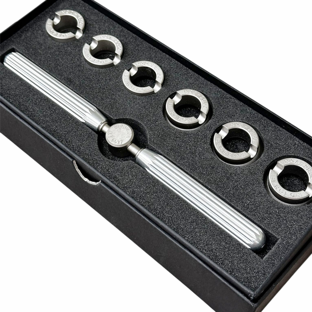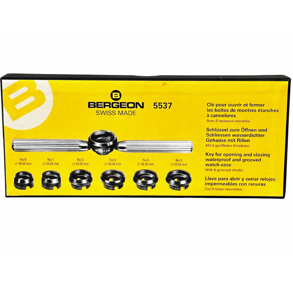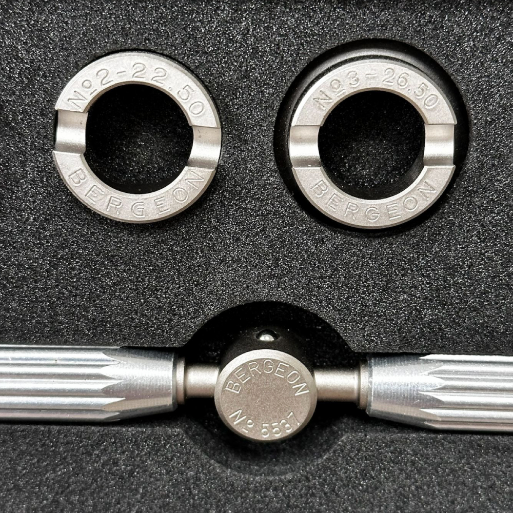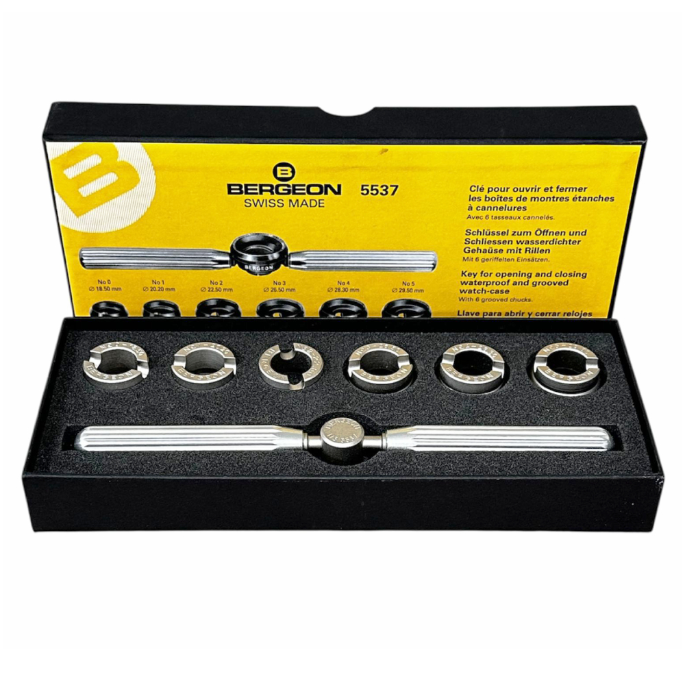 Das Bergeon 5537 ist ein speziell entwickeltes Werkzeugset, das die Öffnung und Verschließung von Uhrwerken mit wasserdichten und geränderten Verschlüssen, insbesondere für Modelle von Rolex und Tudor, erheblich vereinfacht. Dieses hochwertige Werkzeugset ist ein unverzichtbares Hilfsmittel für Uhrmacher und ambitionierte Uhrenliebhaber.