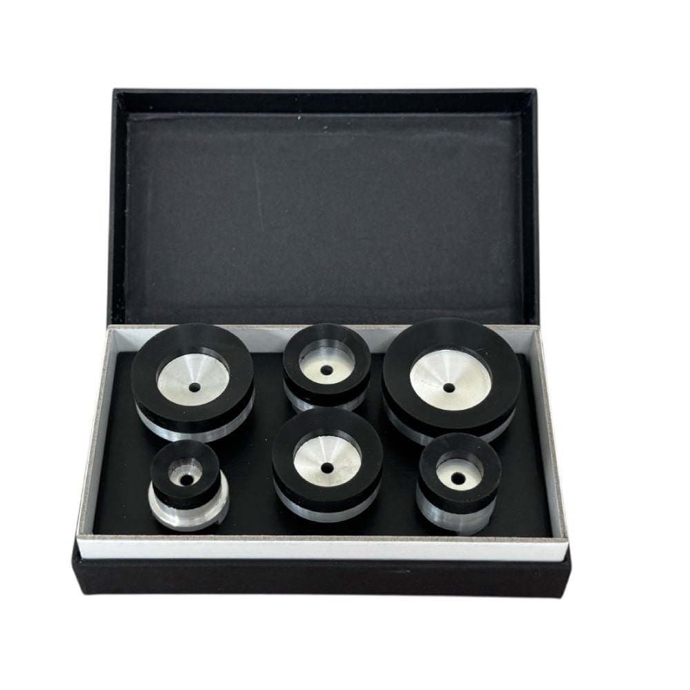 Dieses Premium-Set von 6 Oberzugstempelköpfen, sorgfältig aus weichem Adipren gefertigt, ist speziell für die Verwendung mit der renommierten Bergeon 5700-Z Press konzipiert. Es bietet die ideale Lösung für die präzise Handhabung von Uhrwerkskasten- und Kristallkomponenten. Durch die Verwendung von Adipren wird ein Kratzrisiko minimiert und die empfindlichen Oberflächen geschützt.