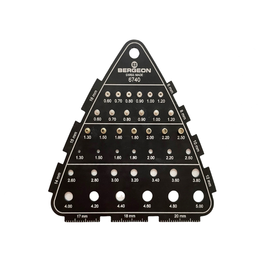 Mit diesem praktischen Werkzeug können Sie den Durchmesser, die Tubenöffnung, den Stiftgewinde, die Laschenbreite und die Tappingsizes Ihrer Kronen einfach und zuverlässig messen. Das Bergeon 6740 bietet eine umfassende Lösung für die Reparatur und den Austausch von Uhrkronen.
