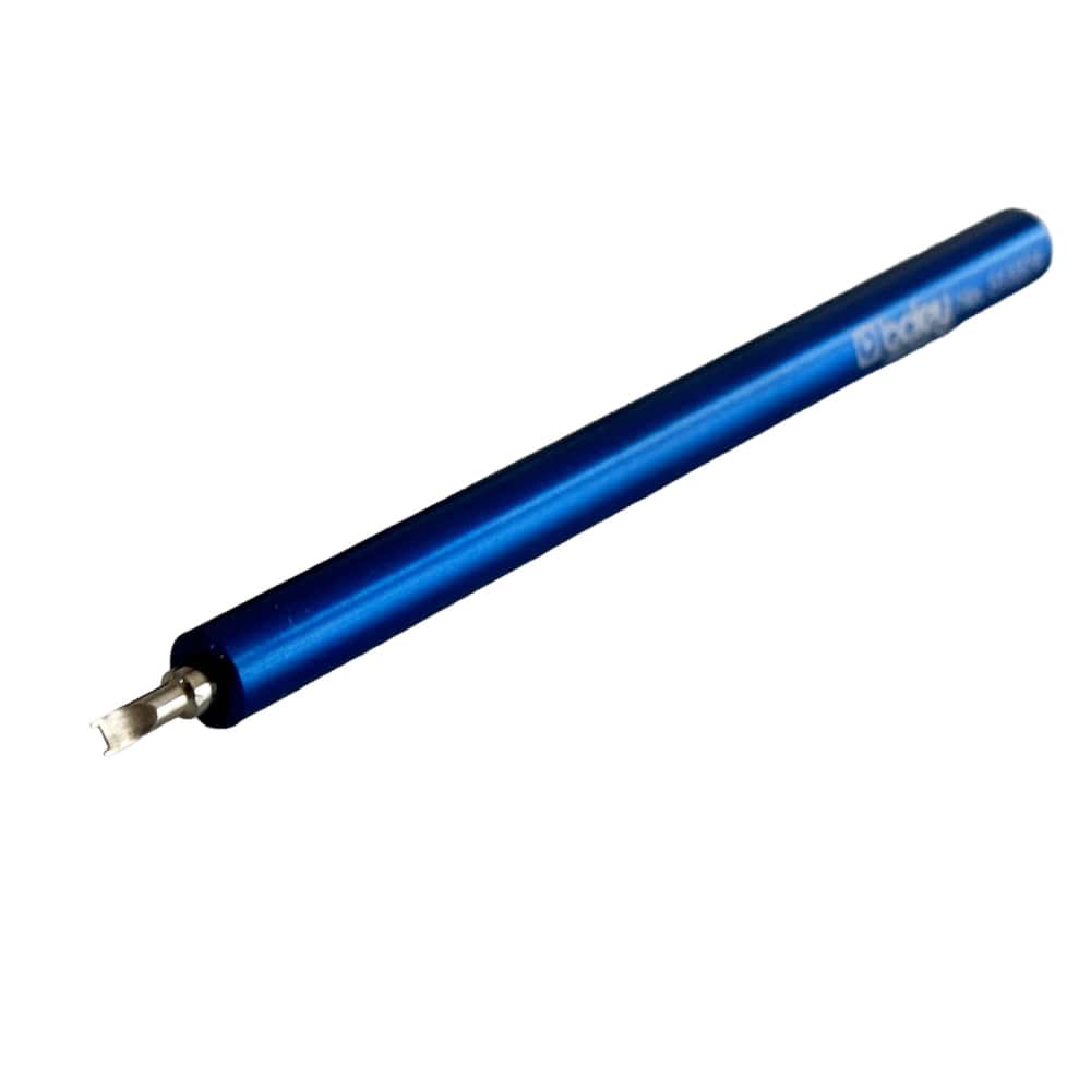 Die ETACHRON Gabel wird in die Öffnung zwischen dem Stift-Halter und dem Regulator eingeführt. Anschließend wird das Stiftelement vorsichtig herausgedrückt. Das Einführen des Stiftelements erfolgt wie bei einem Druckknopf, wobei der Balgenglockenmechanismus (Balgenglockenmechanismus) empfohlen wird, um einen reibungslosen Ablauf zu gewährleisten.