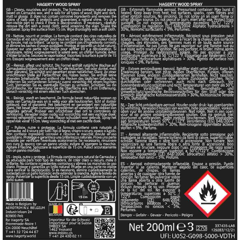 Der Hagerty Holzspray ist eine hochwertige Reinigung- und Polierlösung, speziell für Holzoberflächen entwickelt. Dieser leicht anzuwendende Spray reinigt, pflegt und schützt Holz, hinterlässt eine natürliche, streifenfreie Oberfläche. Er entfernt effektiv Schmutz, Fingerabdrücke und leichte Flecken und verstärkt die natürliche Schönheit von Möbeln und Holzoberflächen. Mit seiner sanften, aber dennoch wirksamen Formel sorgt er für langanhaltende Pflege und Schutz für sowohl behandeltes als auch unbehandeltes Holz.