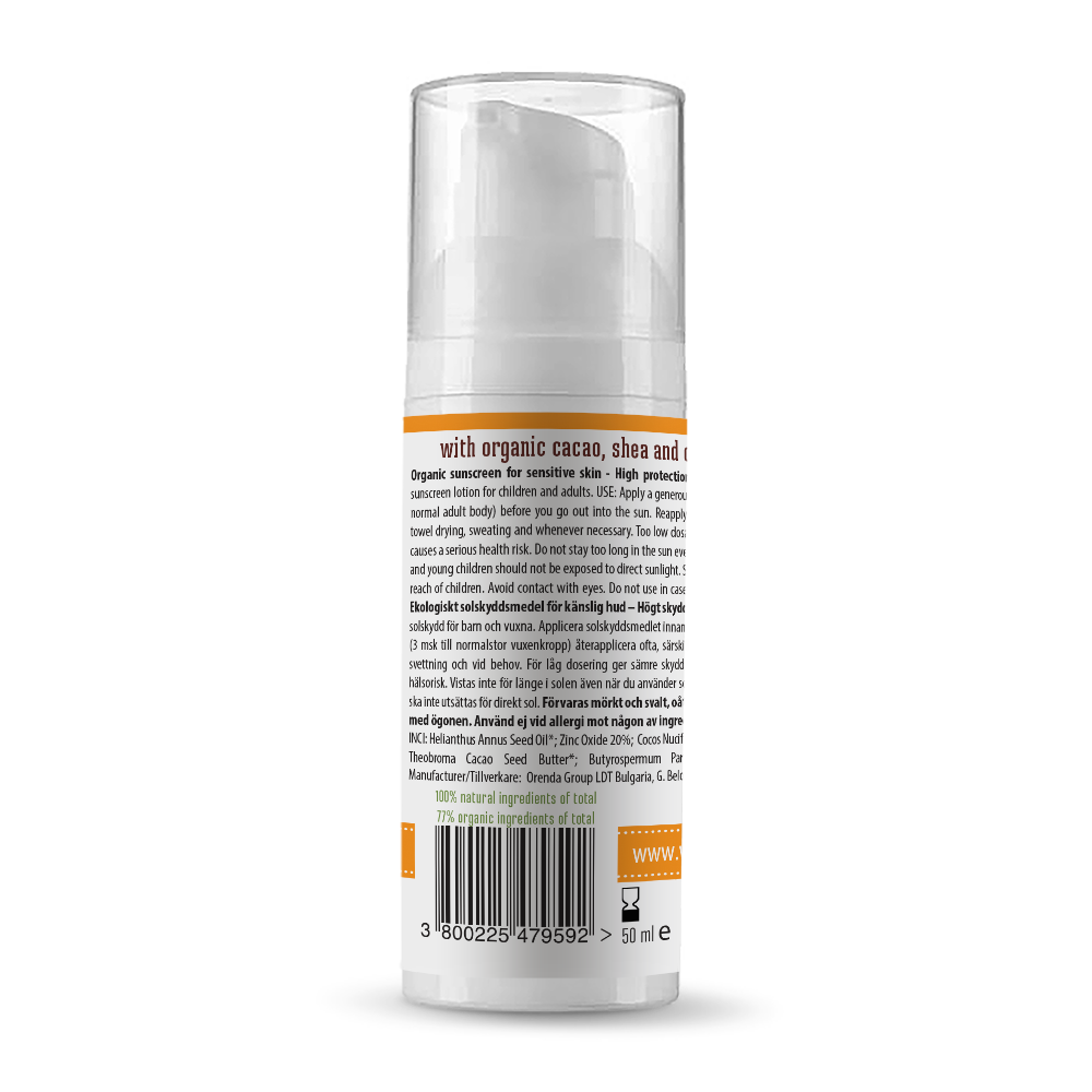 Inhaltsstoffe: Helianthus Annuus Seed Oil (Sonnenblume)*, non-nano Zinc Oxide, Cocos Nucifera Oil*(Kokosöl), Cera Alba (Bienenwachs)*, Butyrospermum Parkii butter* (Shea), Theobroma Cacao Seed Butter*(Kakao), Tocopherol (Vit. E).